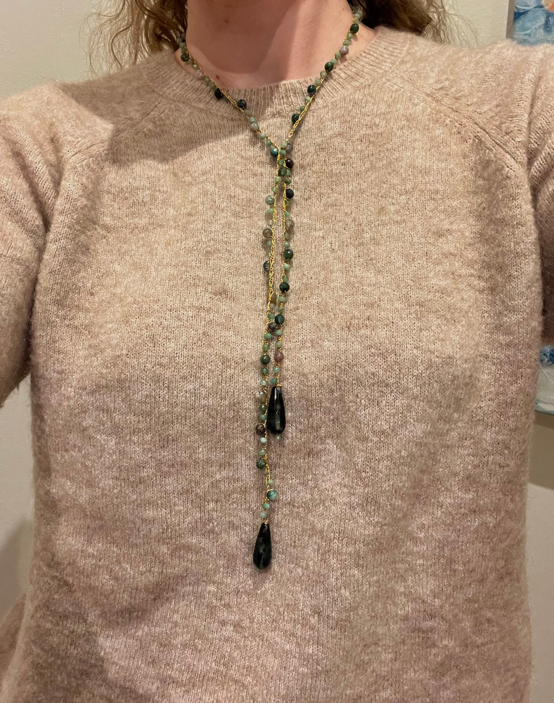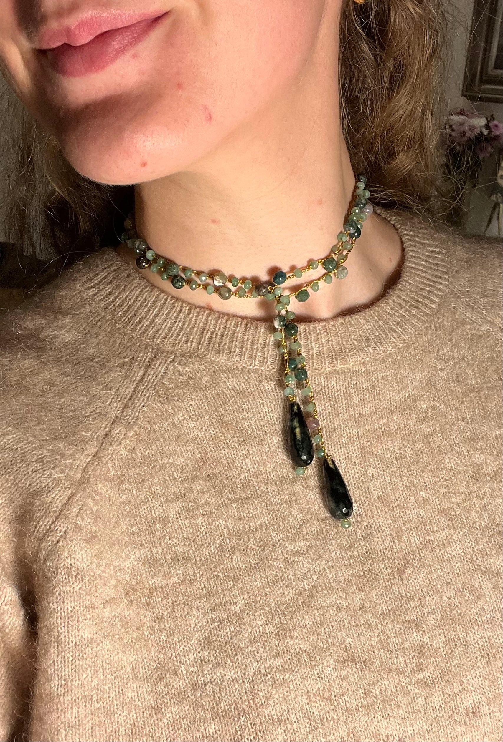 Collar tejido a mano con hilo dorado, cuentas en tonos verde, con terminación piezas de piedra en verde oscuro.