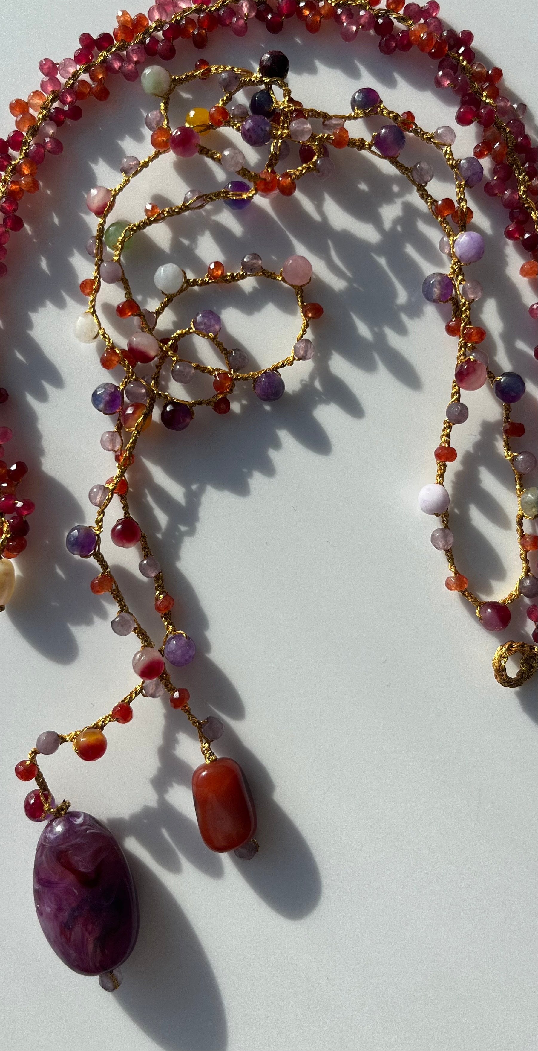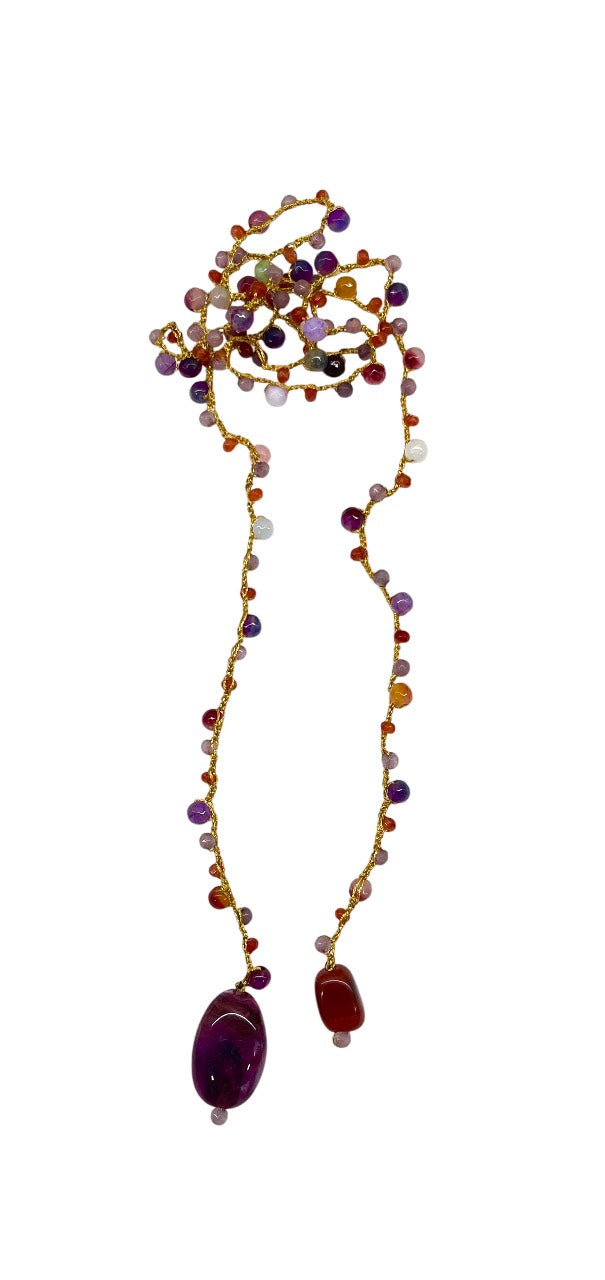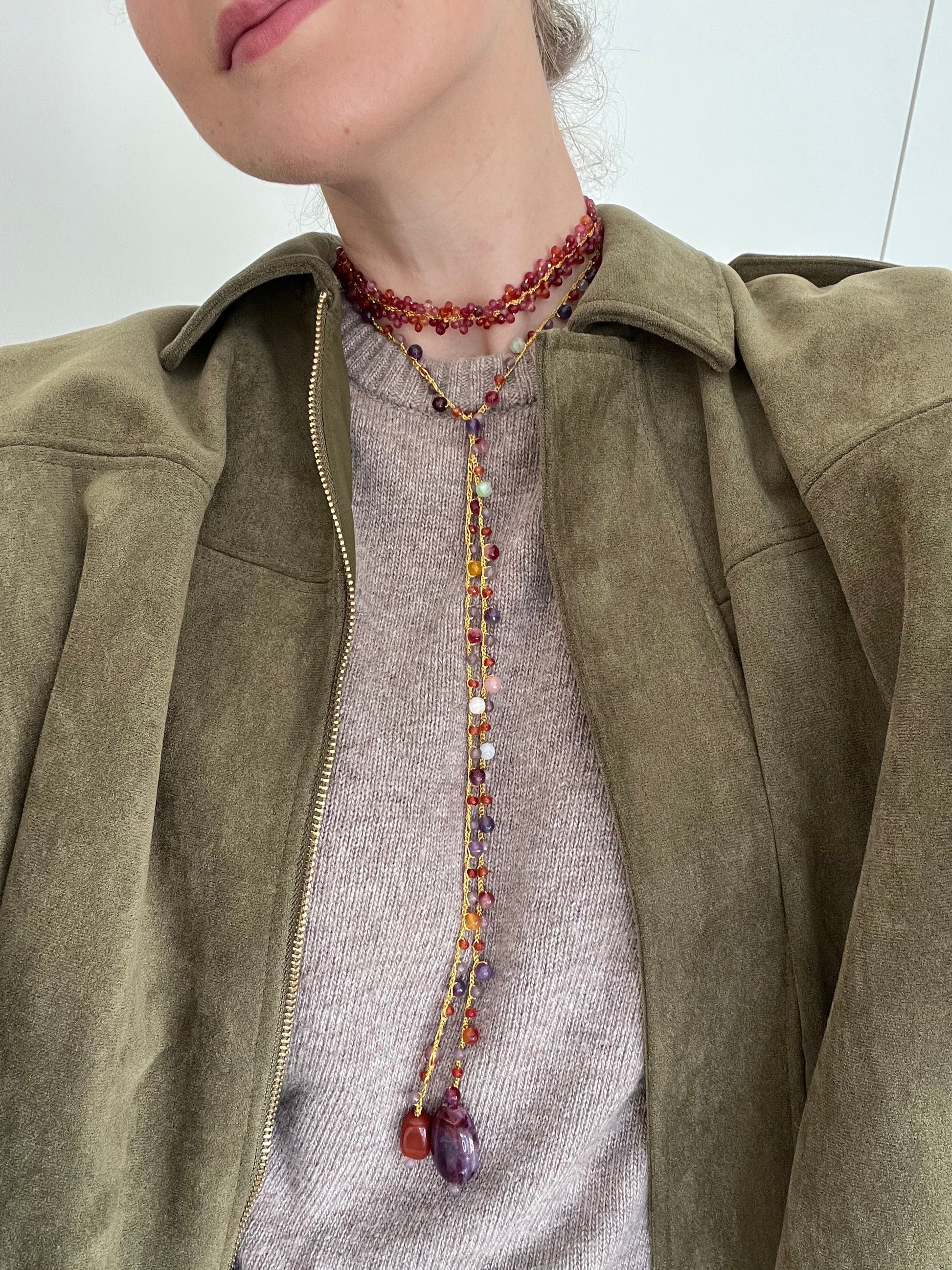 Collar tejido a mano con hilo dorado, cuentas multicolor en tonos morado y naranja, con terminación piezas los mismos tonos. En la tercera imagen está combinado con el Chocker Triple PEACH.