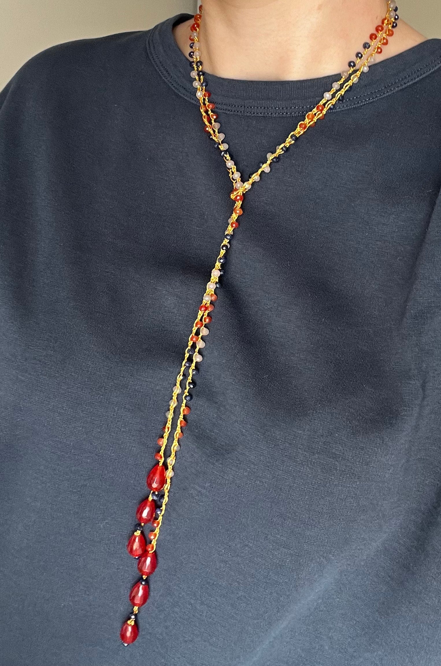 Collar tejido a mano con hilo dorado, cuentas en tonos azul,naranja y gris, con terminación piezas naranjas.
