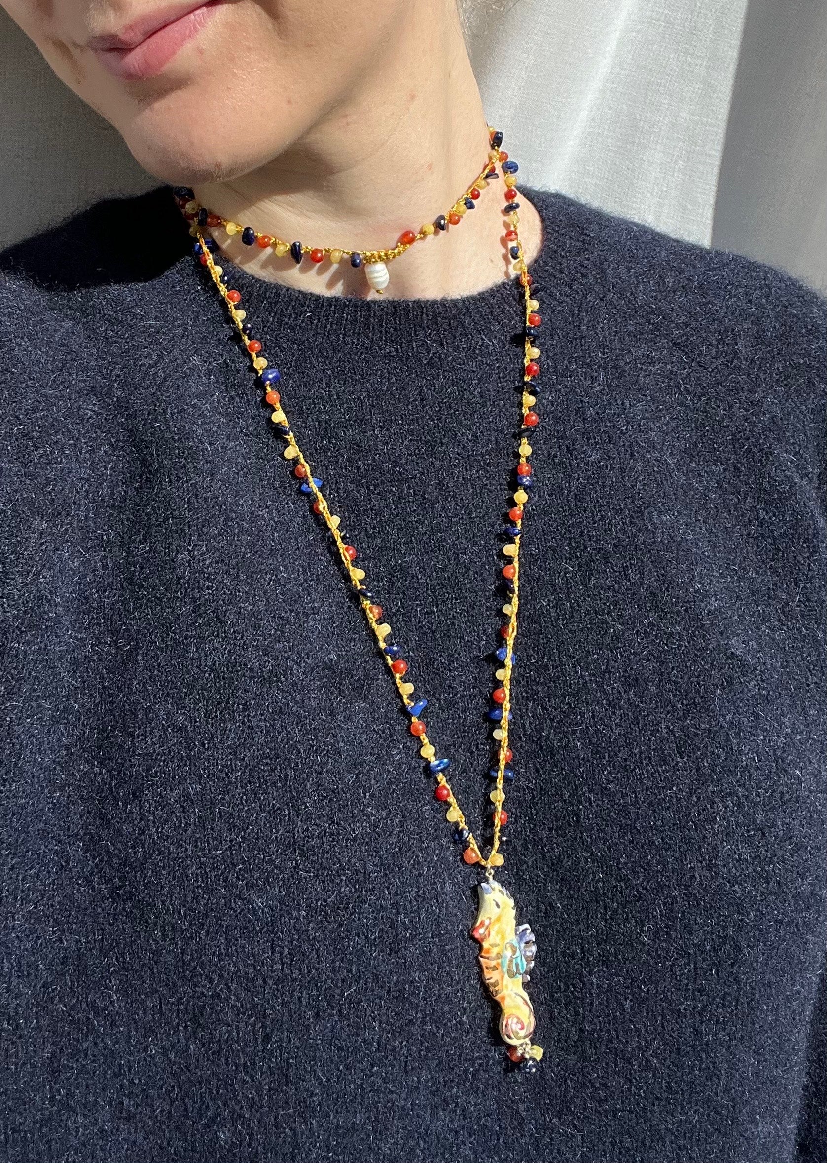 Collar tejido a mano con hilo dorado, cuentas en tonos azul, amarillo y naranja, y colgante caballito de mar de cerámica italiana hecha a mano. Cierre insertando la perla por el círculo de la terminación.