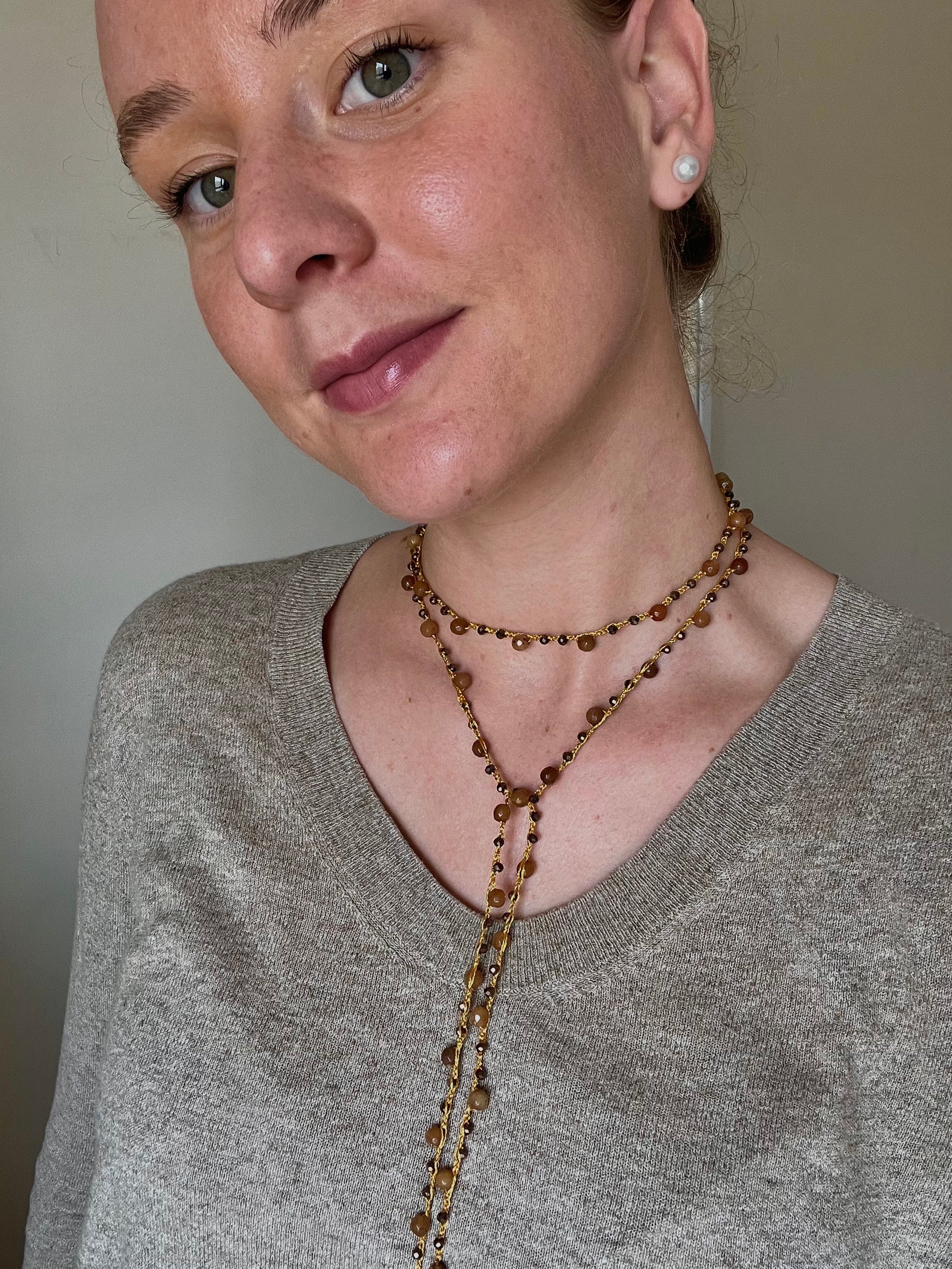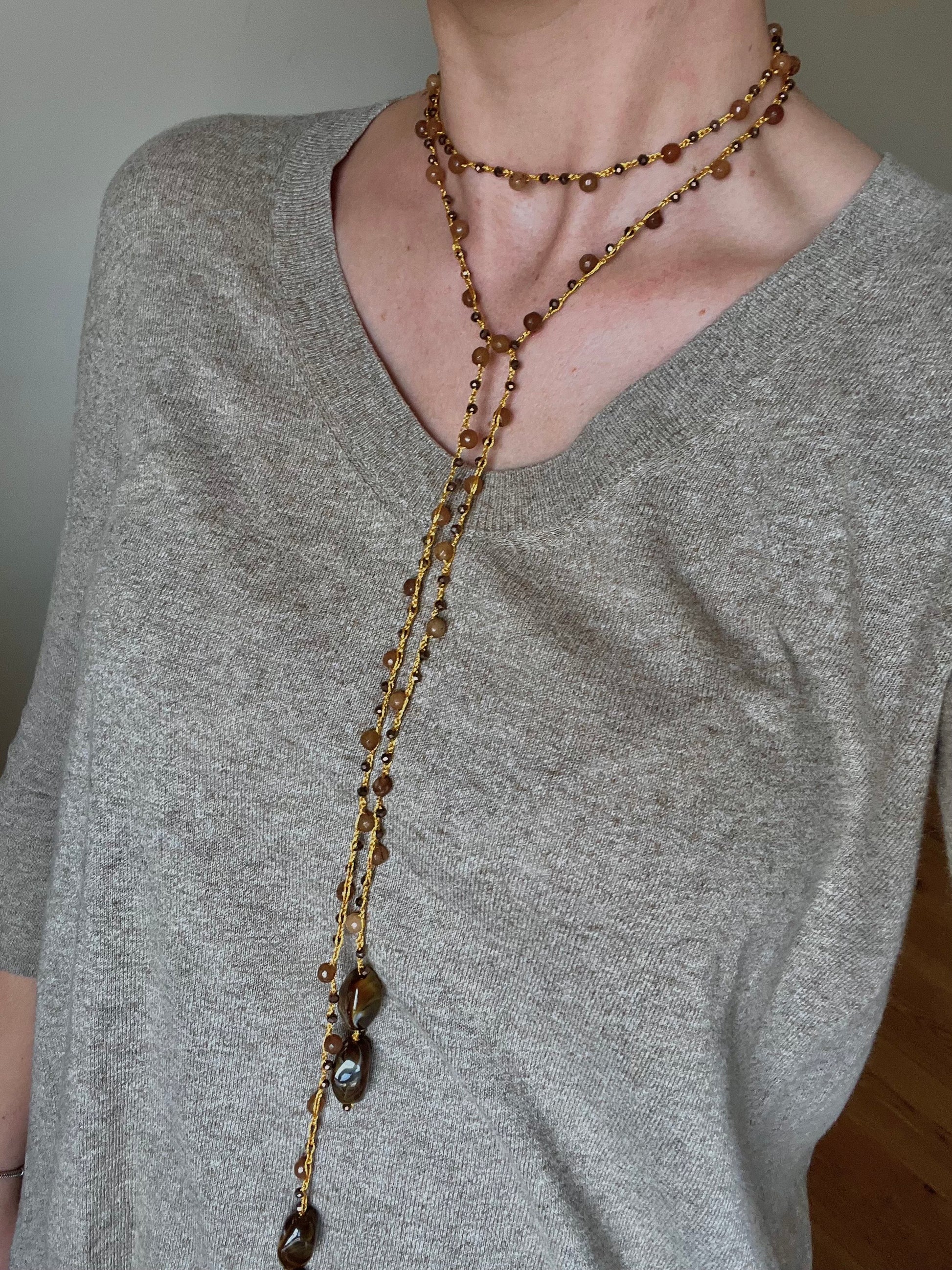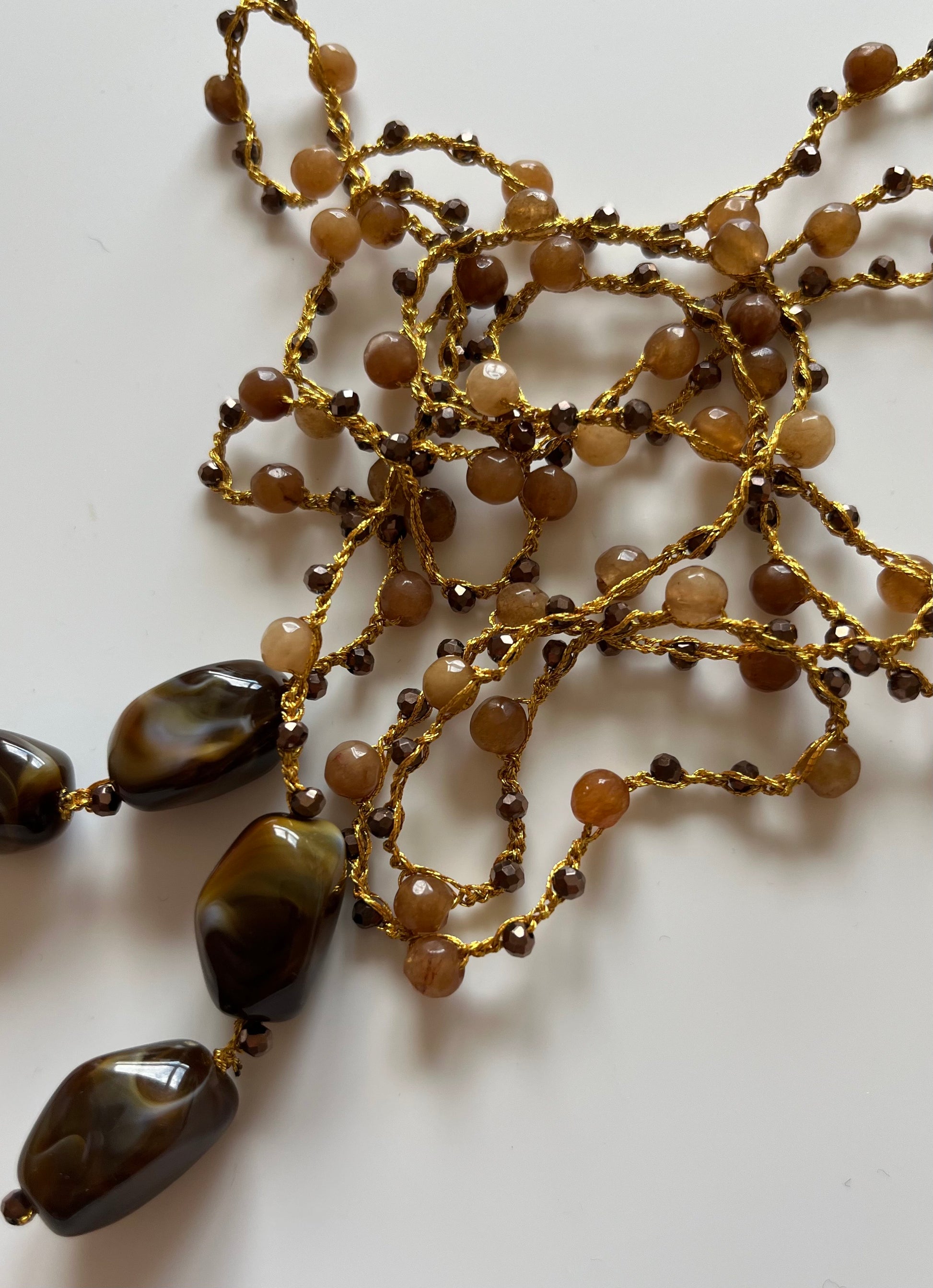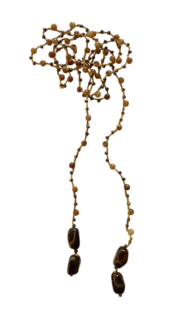 Collar tejido a mano con hilo dorado, cuentas en tonos marrones, con terminación piezas en degradado marrón.