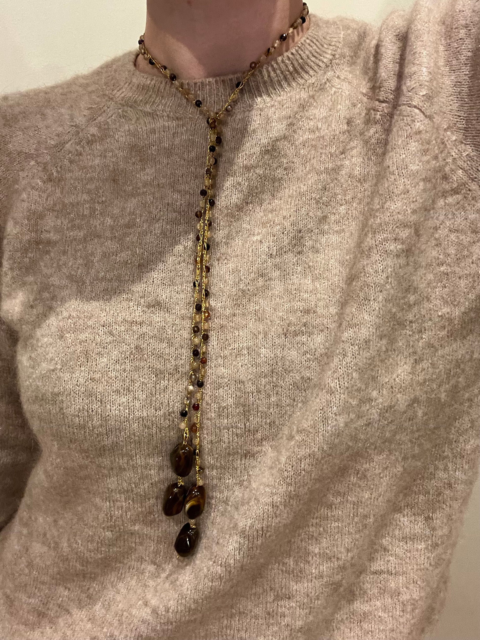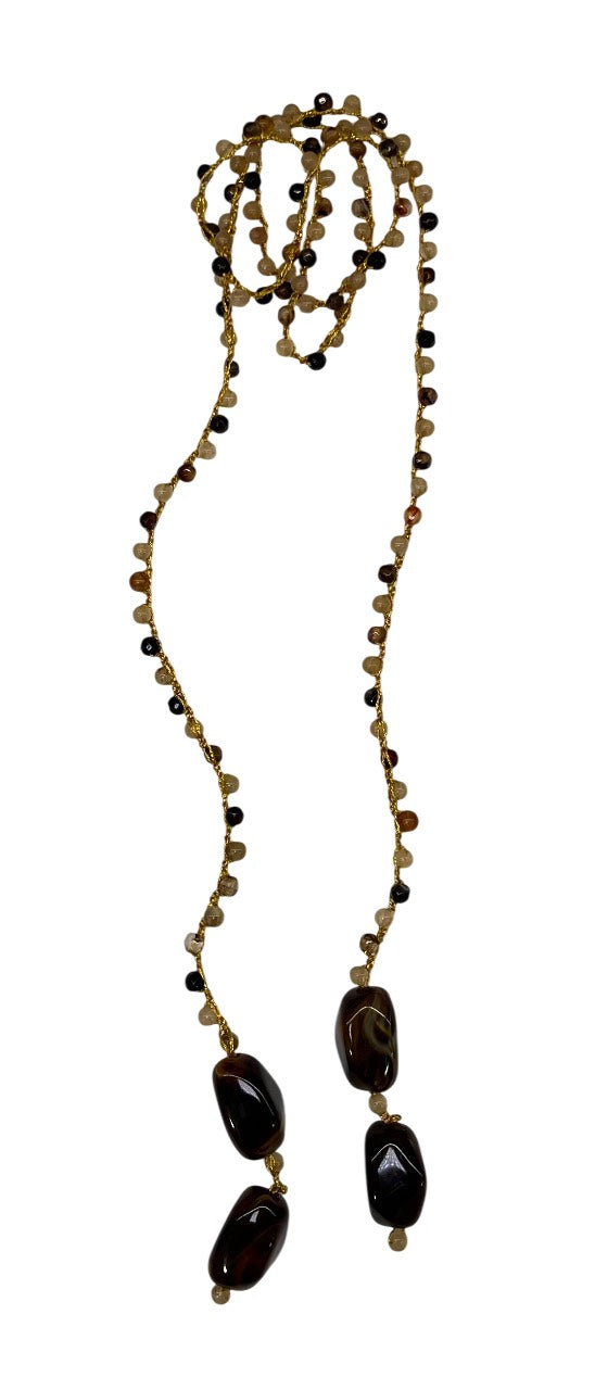 Collar tejido a mano con hilo dorado, cuentas en tonos marrón y beige, con terminación piezas en color marrón.