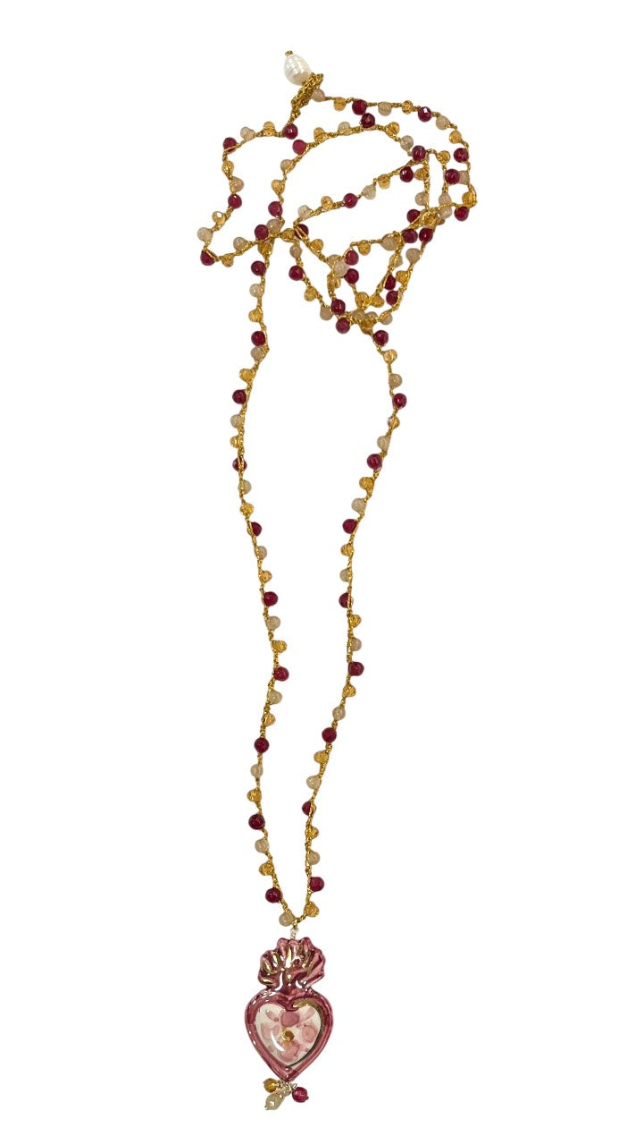 Collar tejido a mano con hilo dorado, cuentas en tonos rosa, amarillo y beige, y colgante corazón de cerámica italiana hecha a mano. Cierre insertando la perla por el círculo de la terminación.