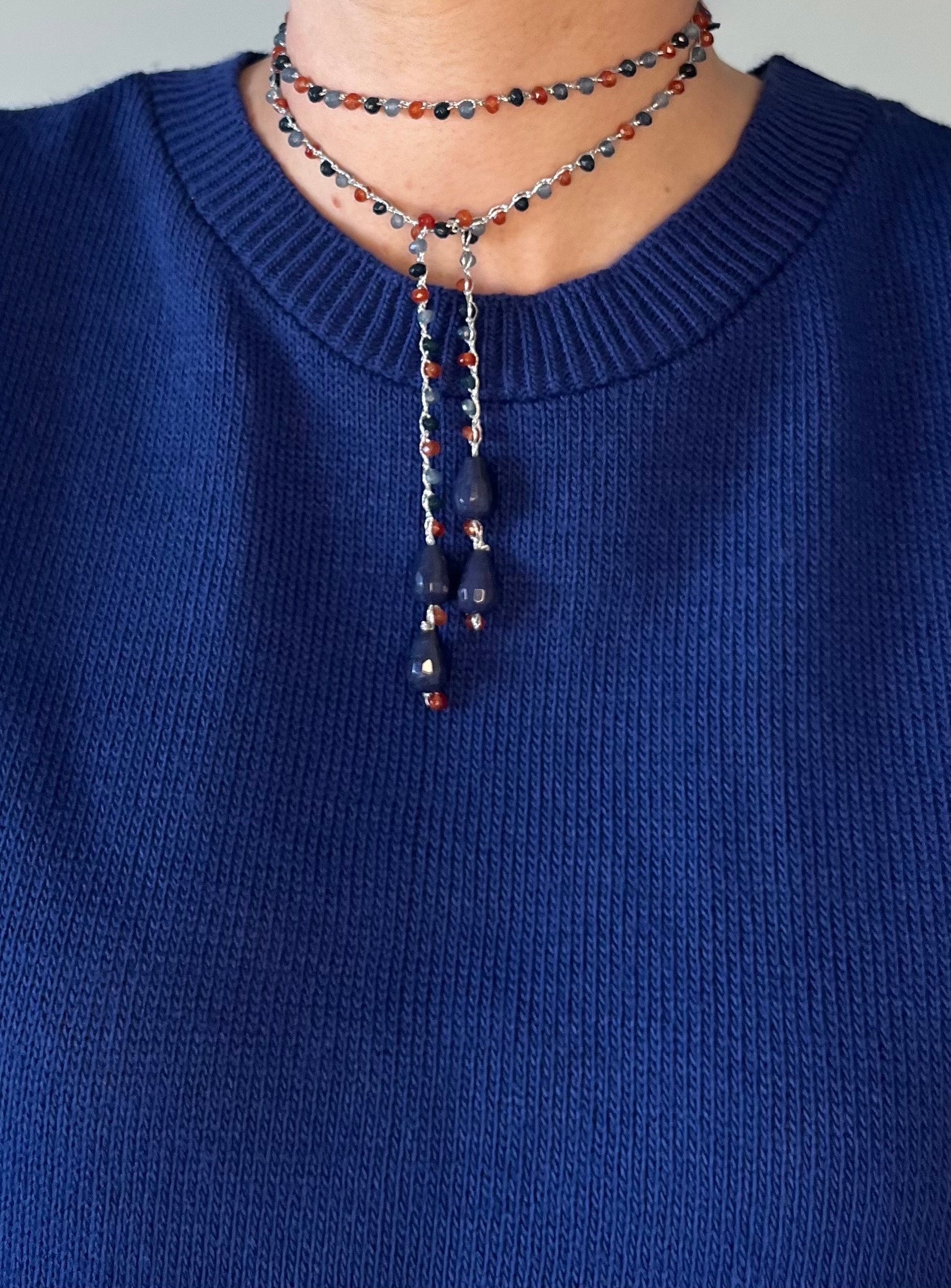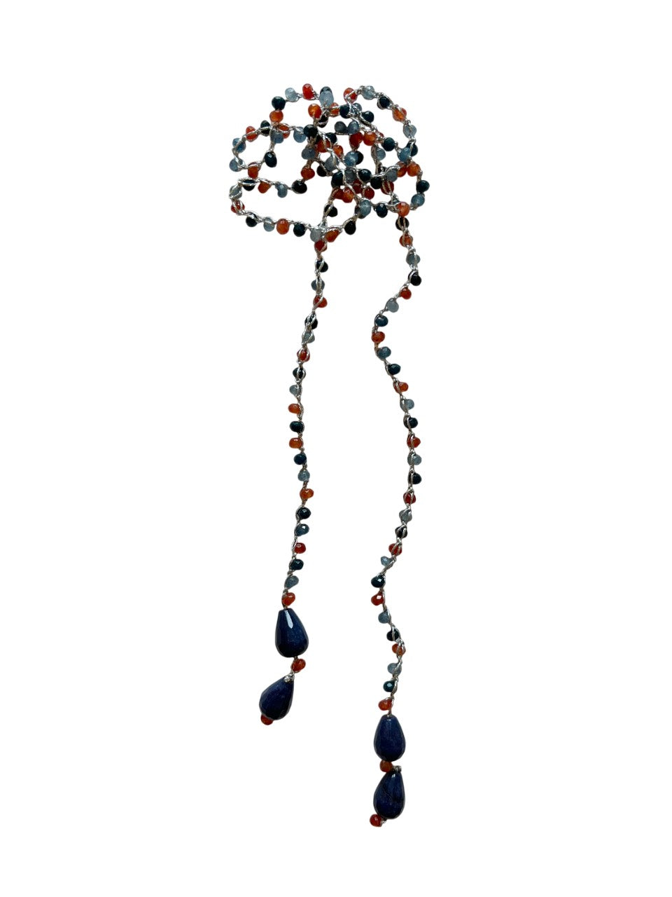 Collar tejido a mano con hilo plateado, cuentas de piedra teñida en tonos azul y naranja, y terminación con piezas azules.
