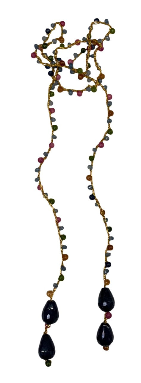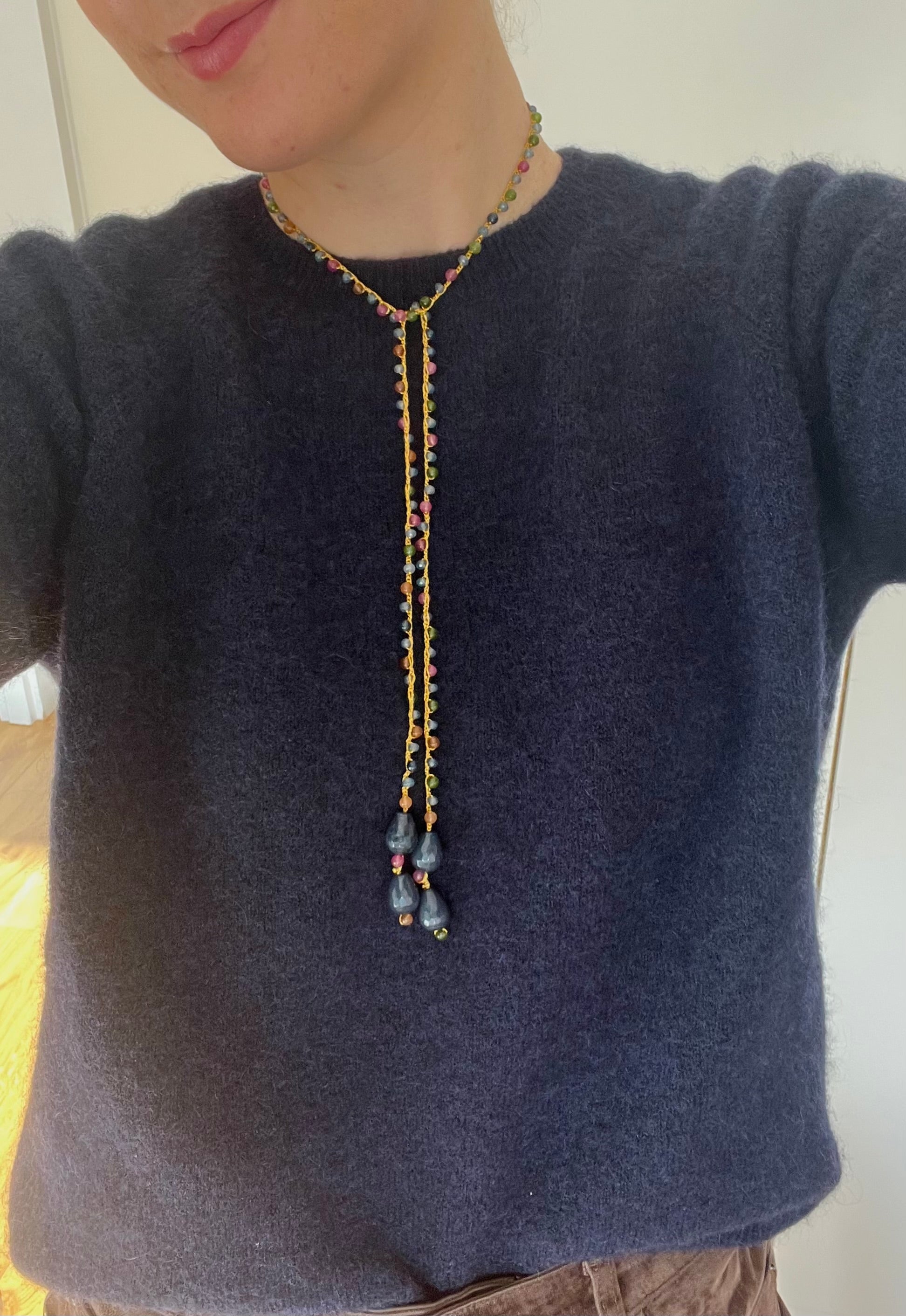 Collar tejido a mano con hilo dorado, cuentas de colores (azul, verde, rosa, naranja), con terminación piezas en color azul.
