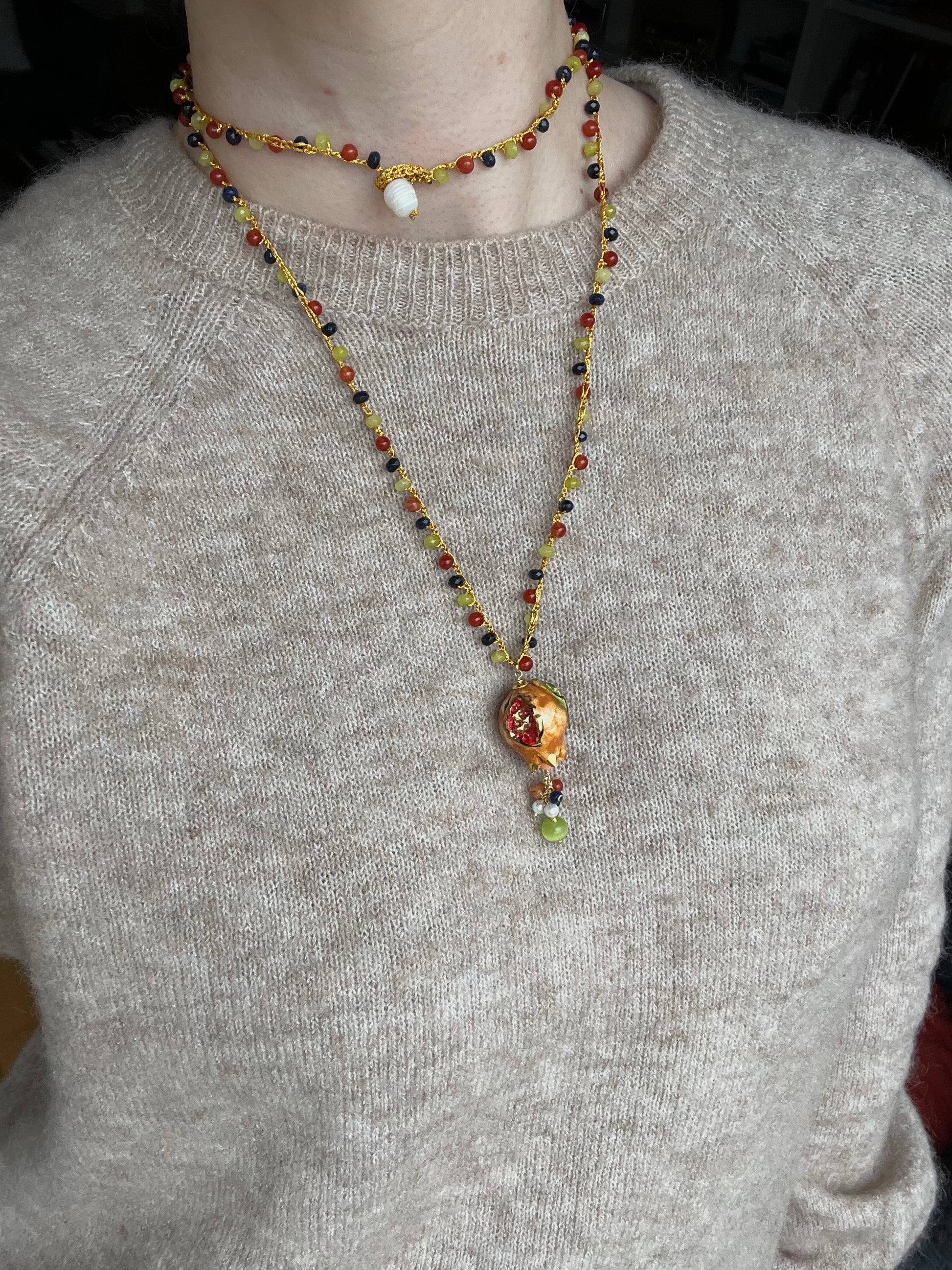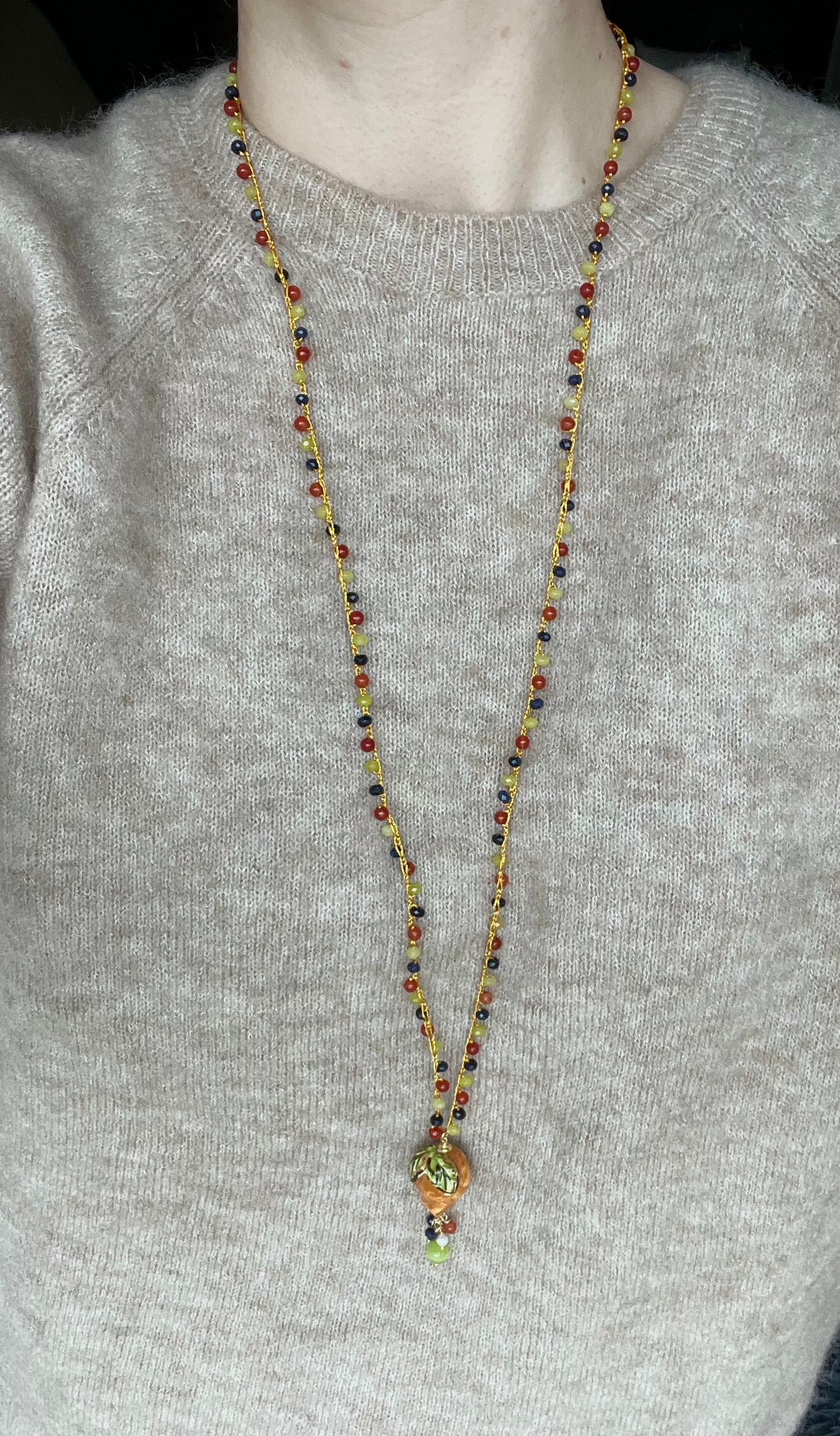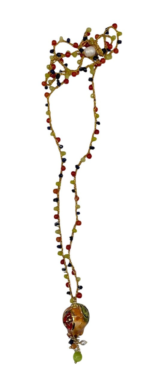 Collar tejido a mano con hilo dorado, cuentas en tonos azul, amarillo y naranja, y colgante granada de cerámica italiana hecha a mano. Cierre insertando la perla por el círculo de la terminación.
