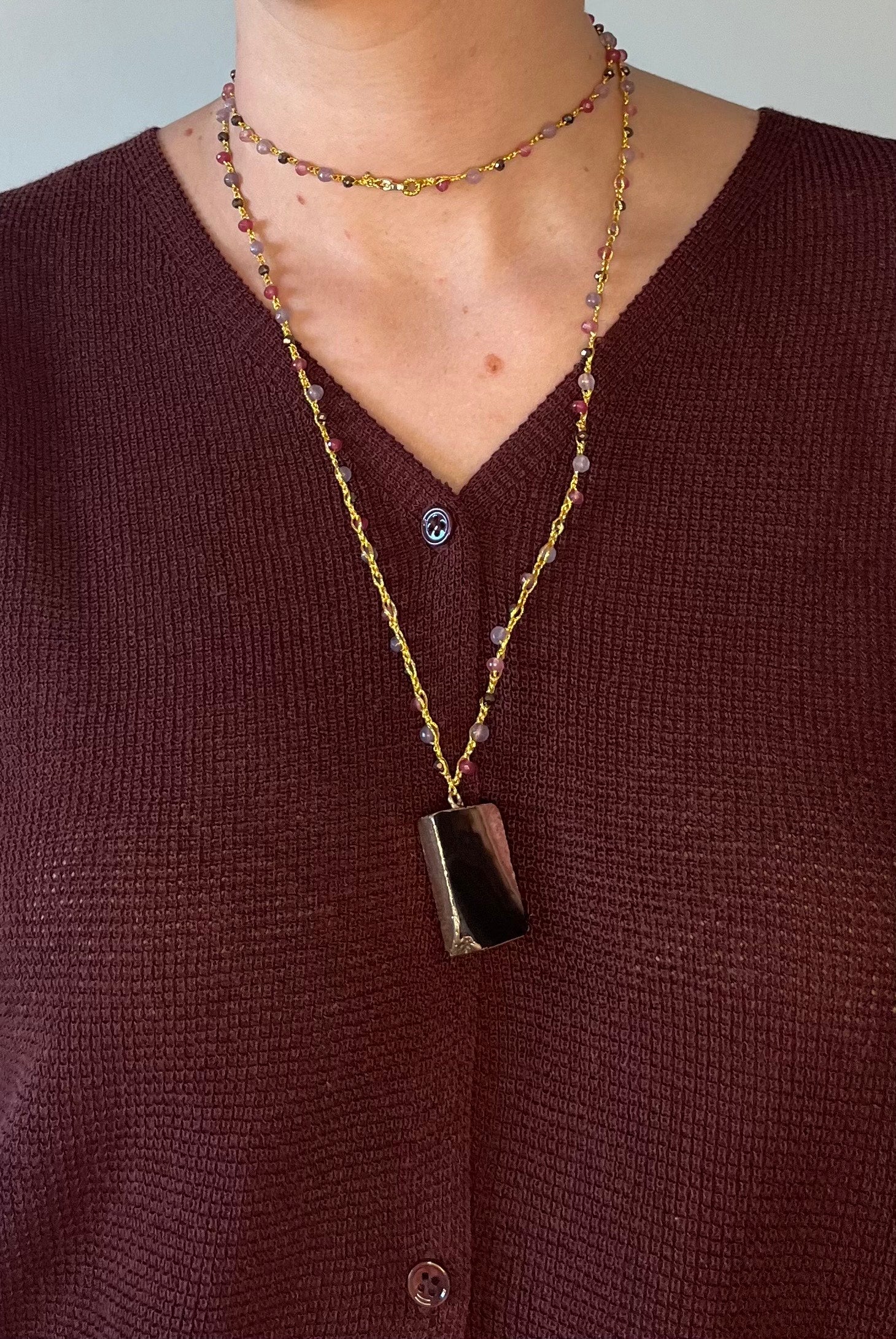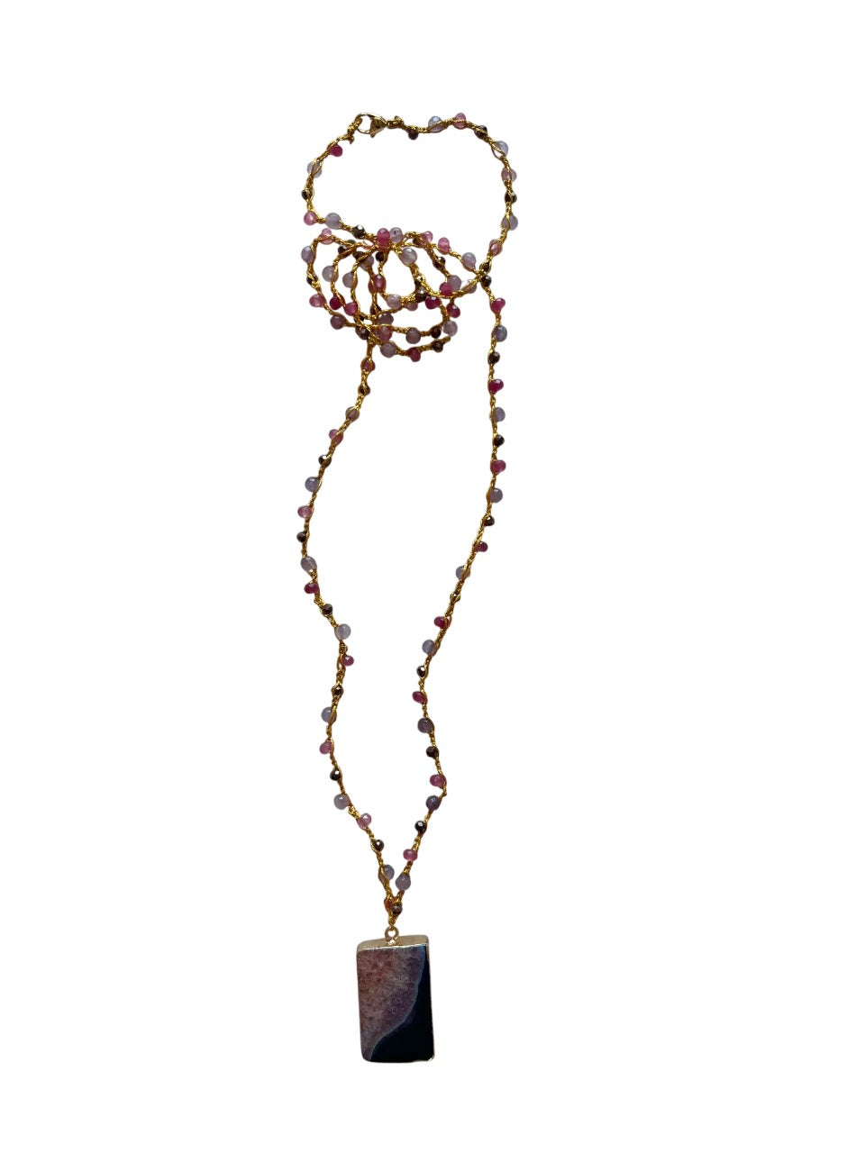 Collar tejido a mano con hilo dorado, cuentas de piedra teñida en tonos rosa, marrón y morado, con colgante piedra en degradado rosa-marrón. Cierre broche chapdo en oro 18k.