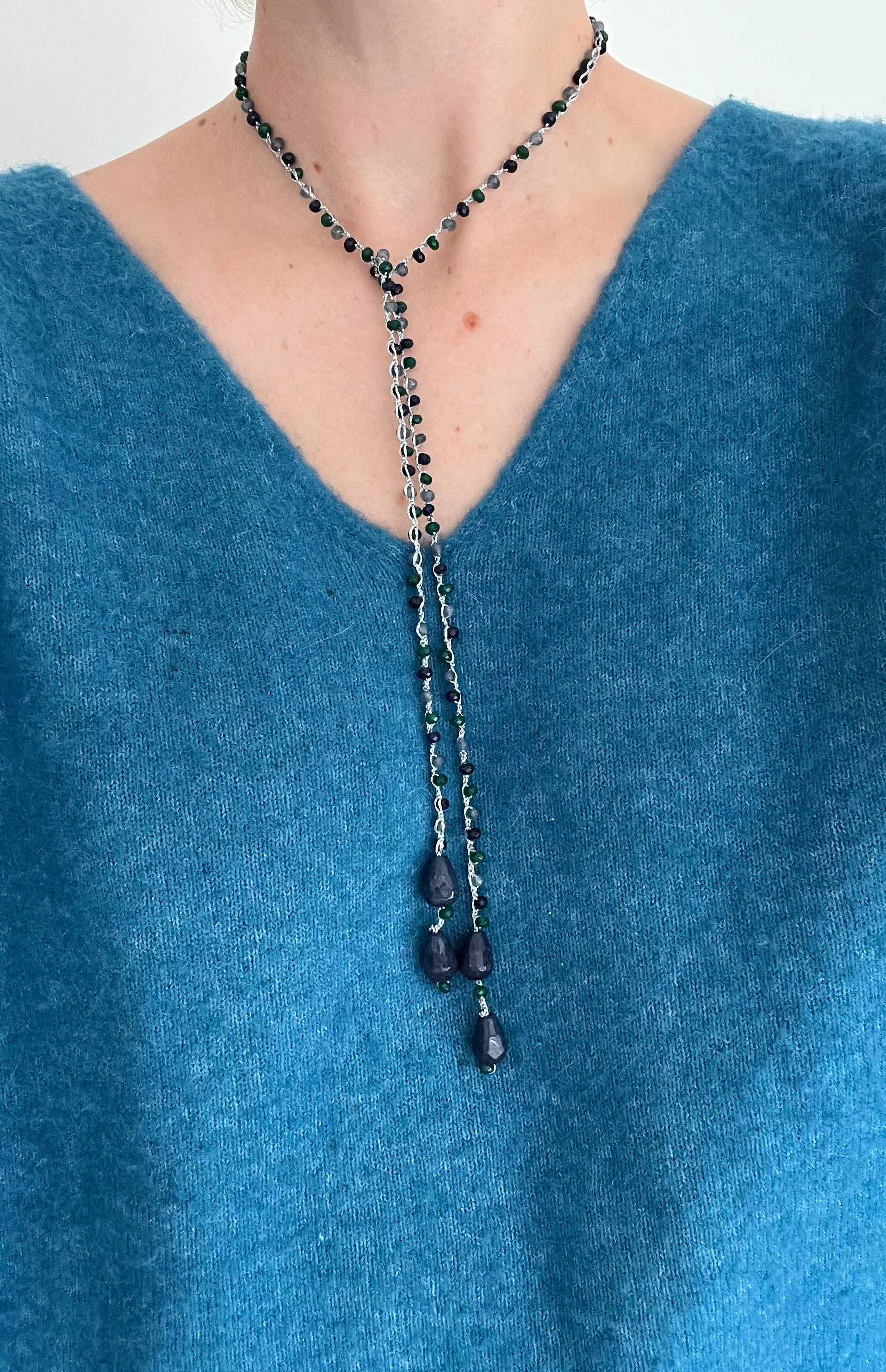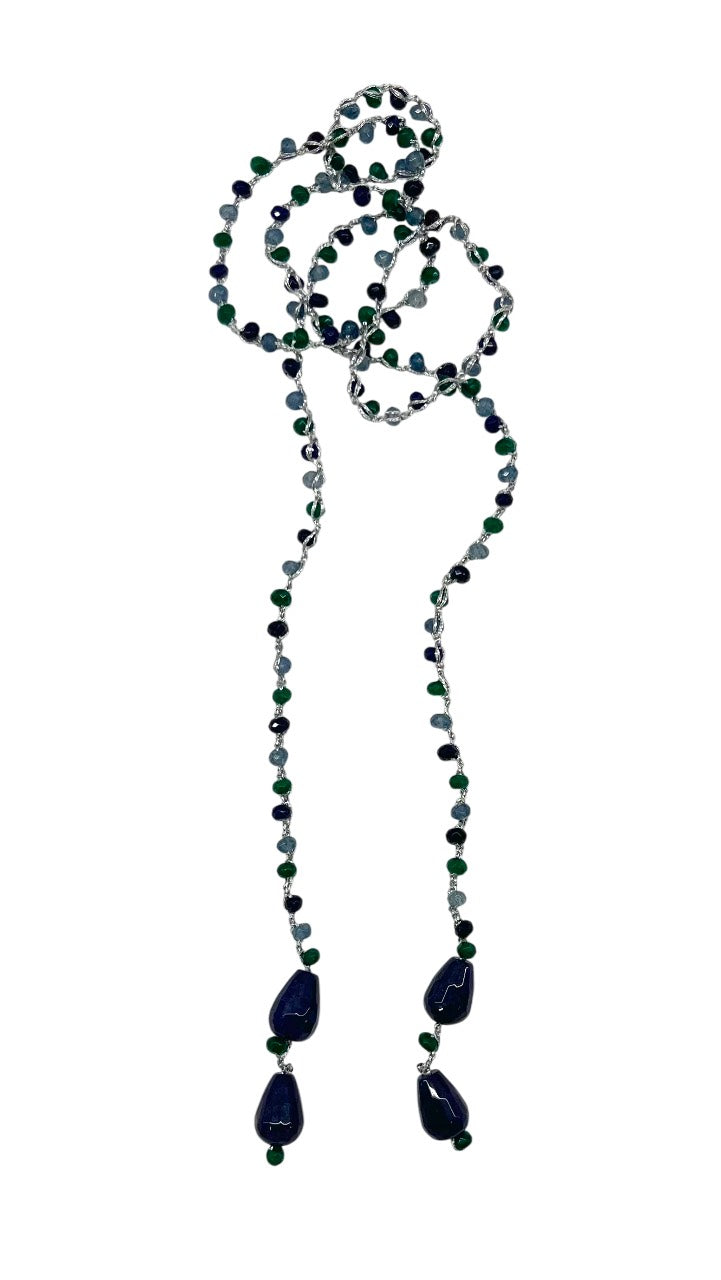 Collar tejido a mano con hilo plateado, cuentas en tonos azul y verde, con terminación piezas azul marino. En la tercera imagen está combinado con el chocker NOCHE.
