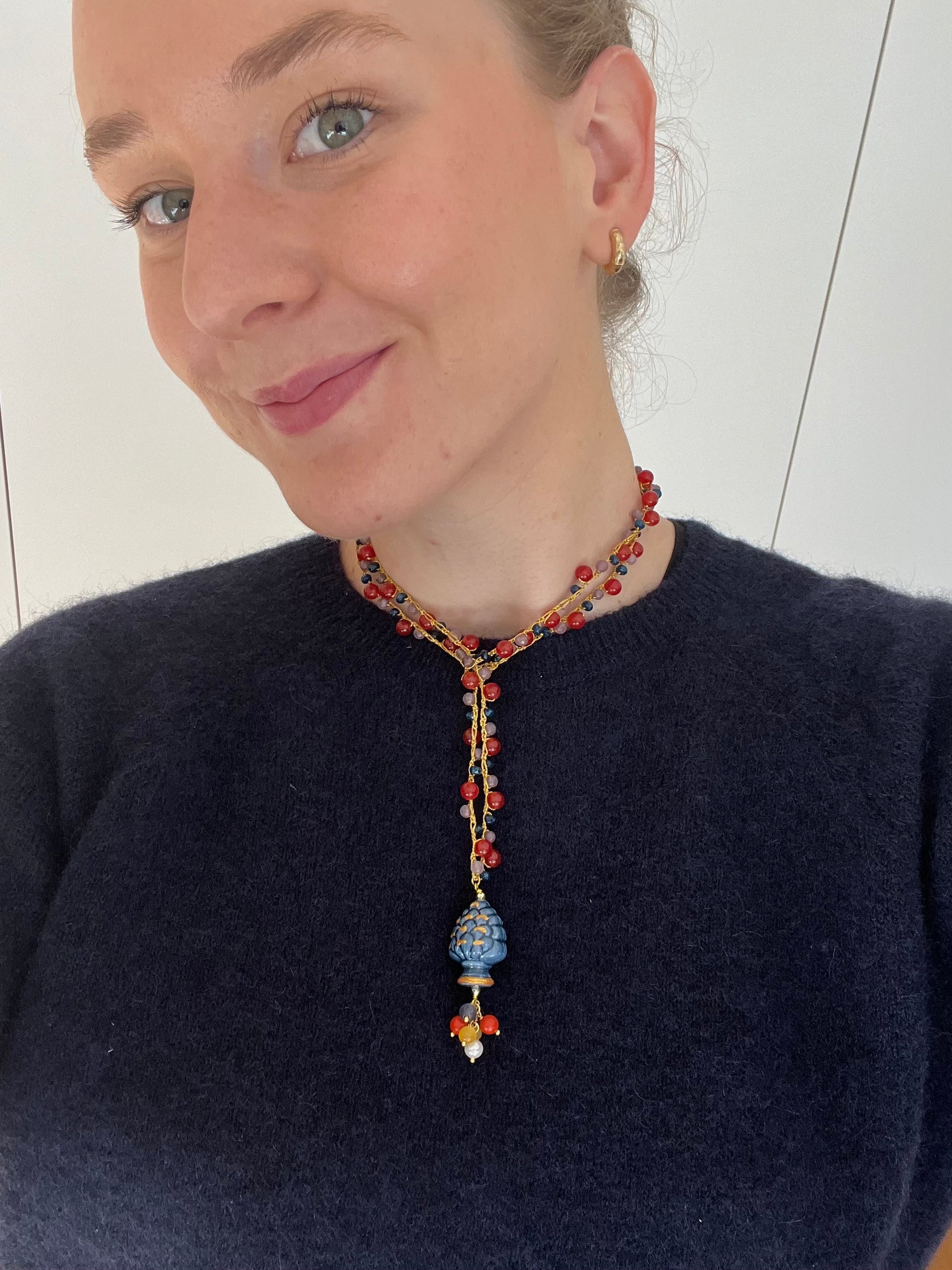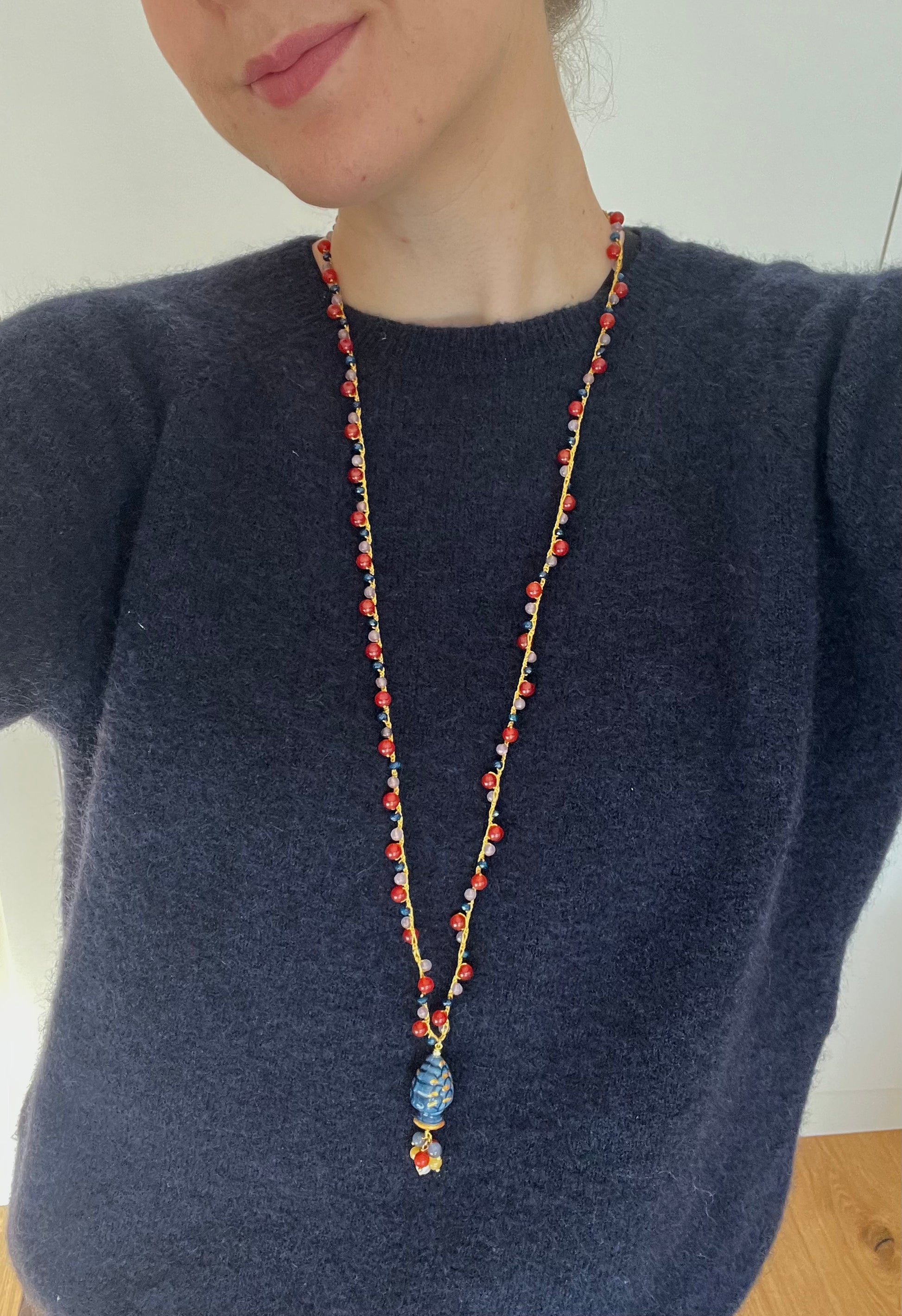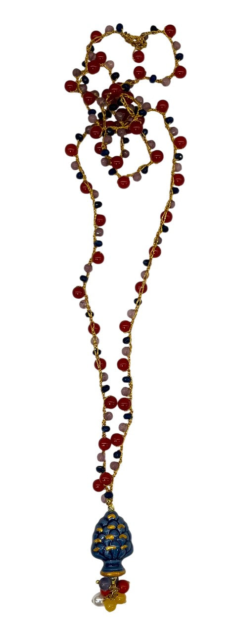 Collar tejido a mano con hilo dorado, cuentas en tonos azul, lila y naranja, y colgante piña azul de cerámica italiana hecha a mano. Cierre insertando última cuenta por el círculo de la terminación.