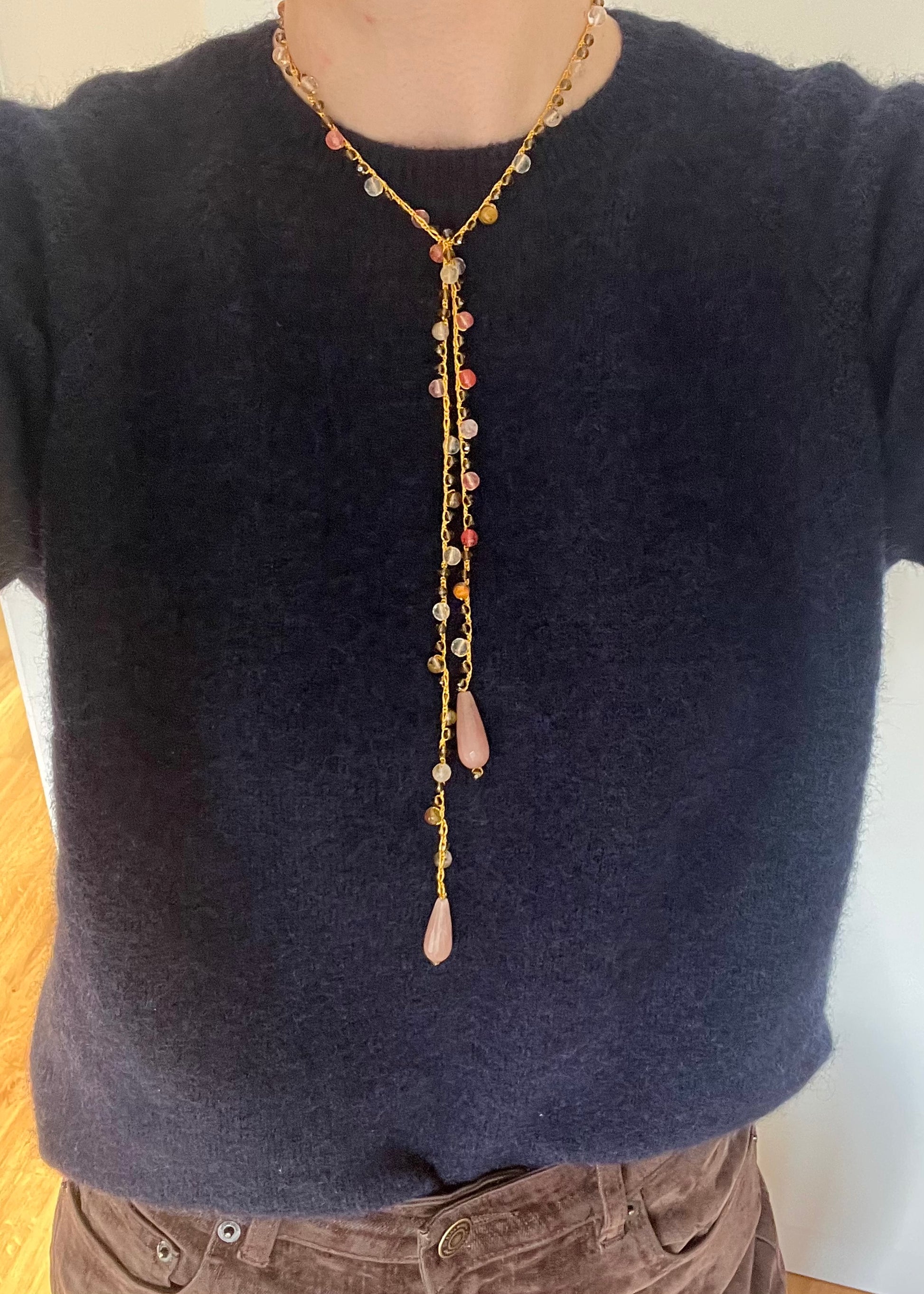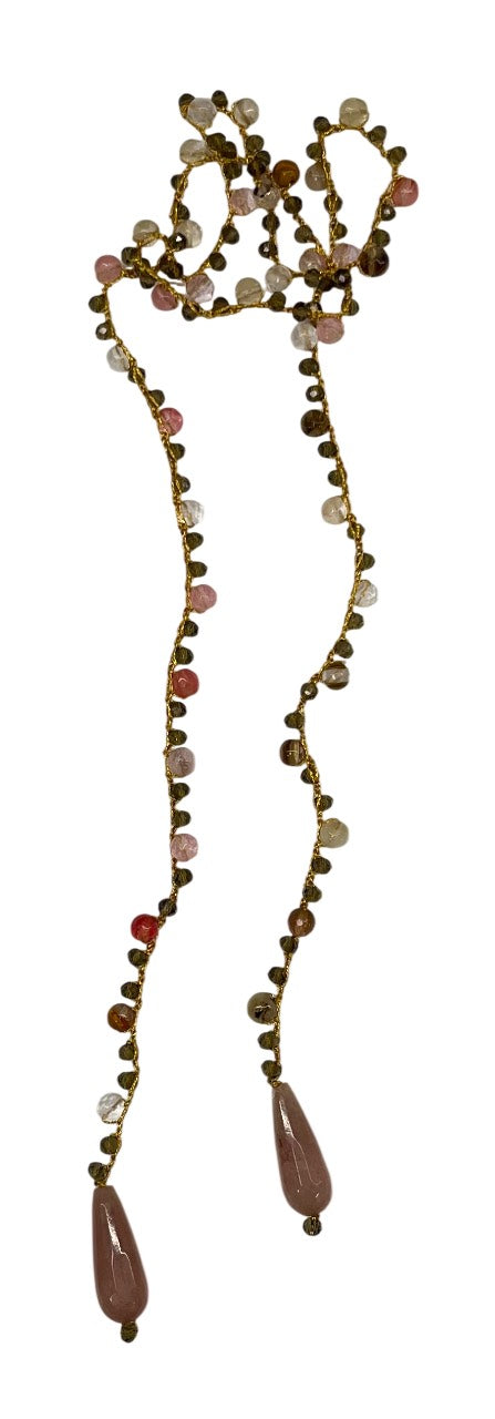 Collar tejido a mano con hilo dorado, cuentas en tonos rosa y beige, con terminación piezas piedra en tono rosa.