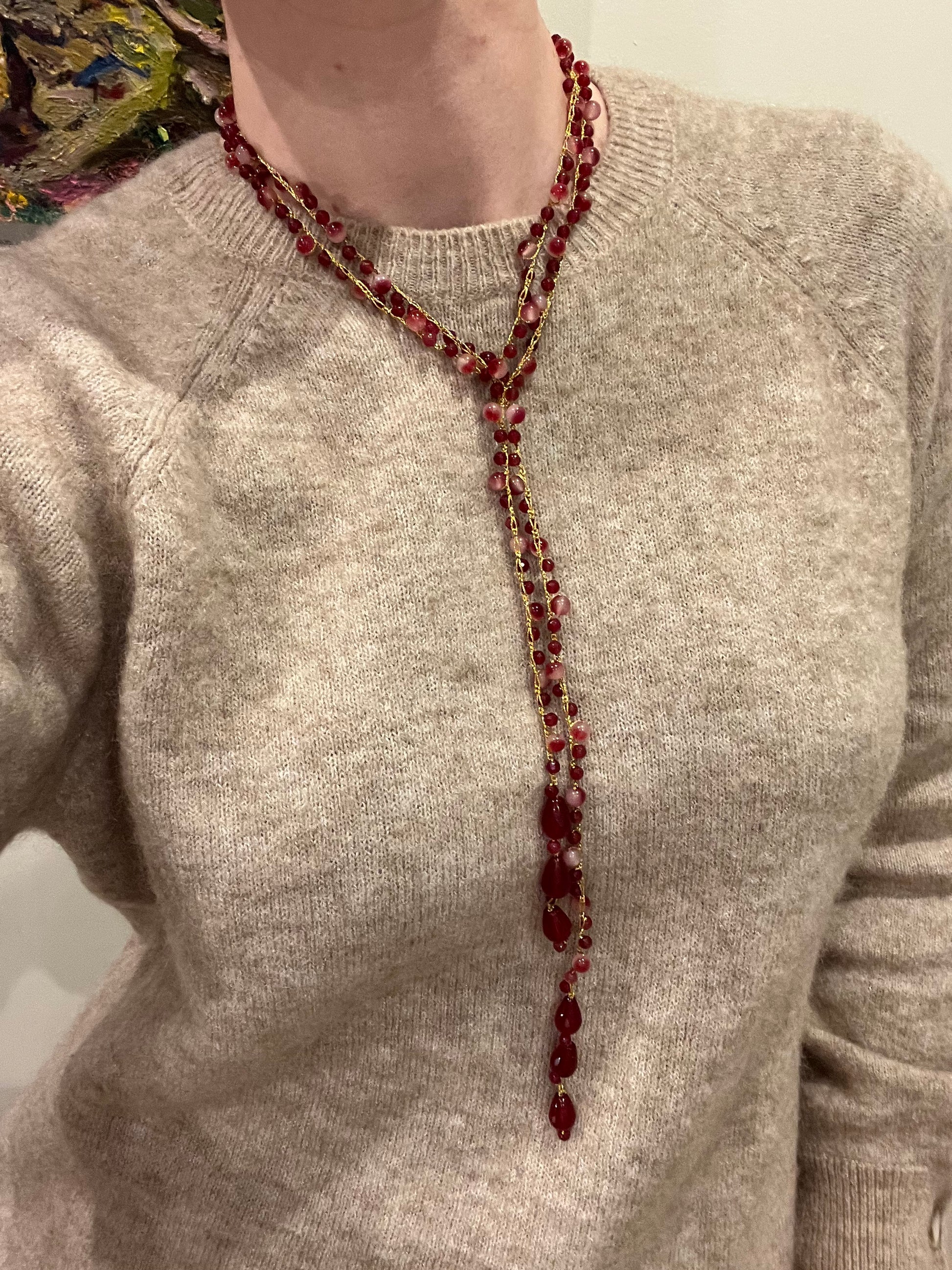 Collar tejido a mano con hilo dorado, cuentas en tonos rosas, con terminación piezas en el mismo tono.