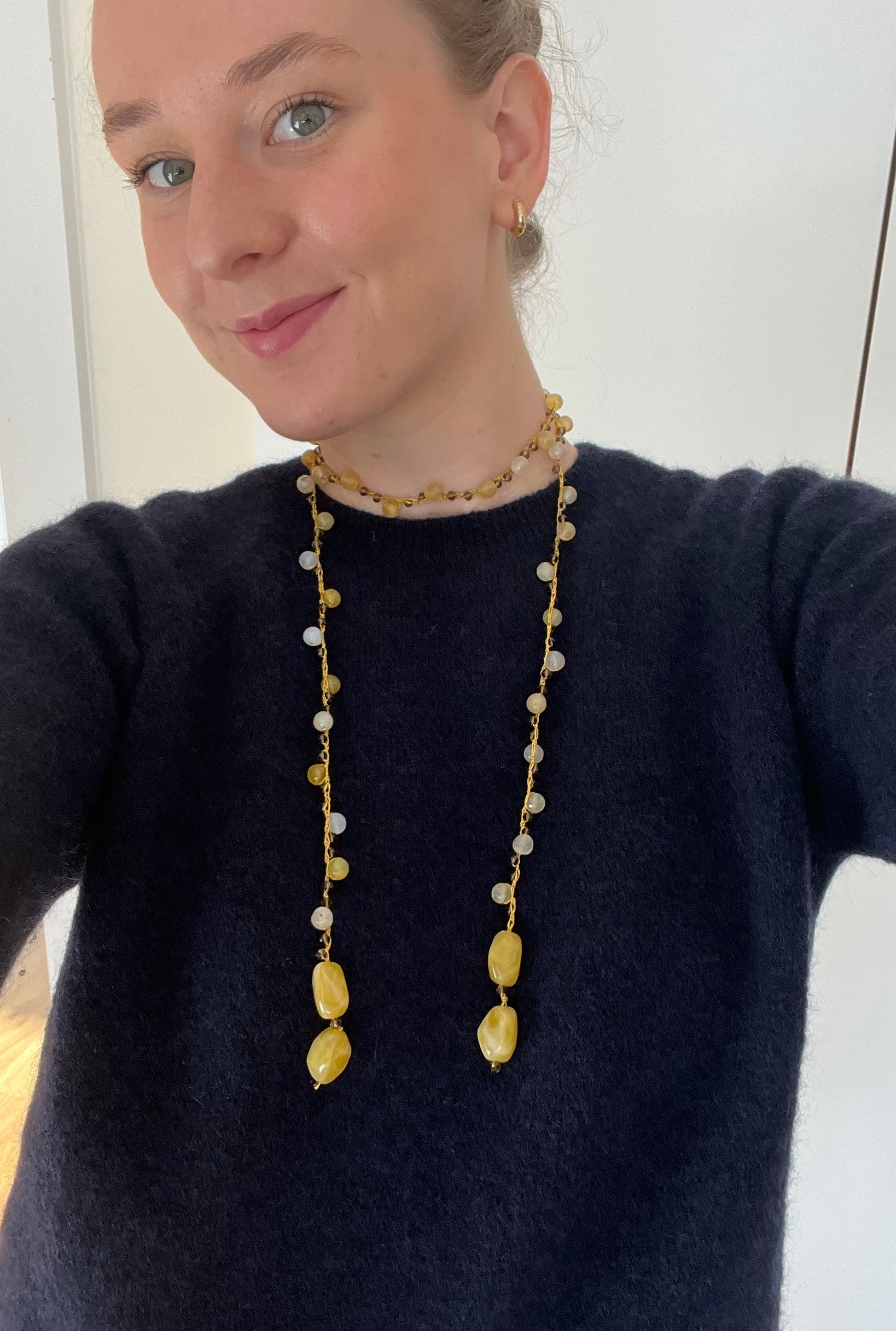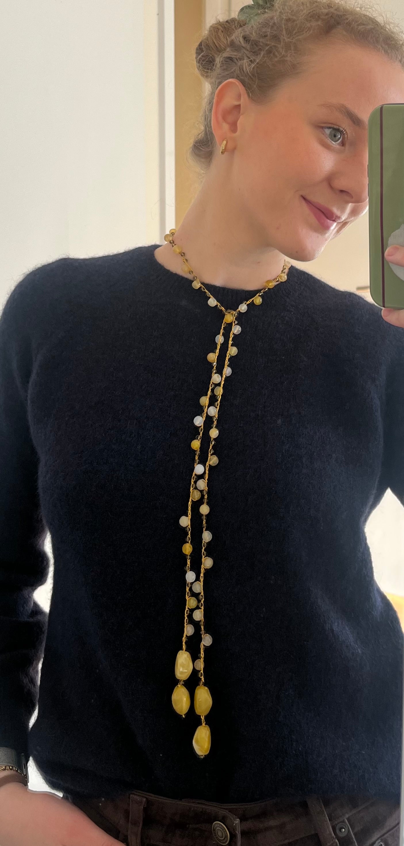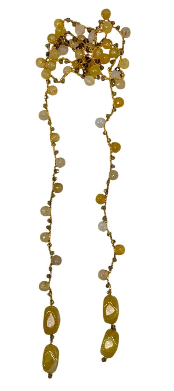 Collar tejido a mano con hilo dorado, cuentas en tonos amarillo y beige, con terminación piezas amarillas.